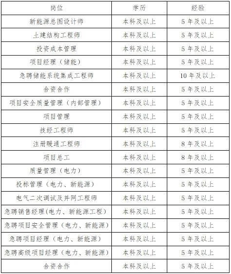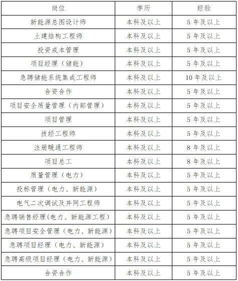 以上岗位要求:统招本科及以上学历,岗位相关证书/职称,5年及以上电力/新能源相关工作经验,岗位细则具体详谈。