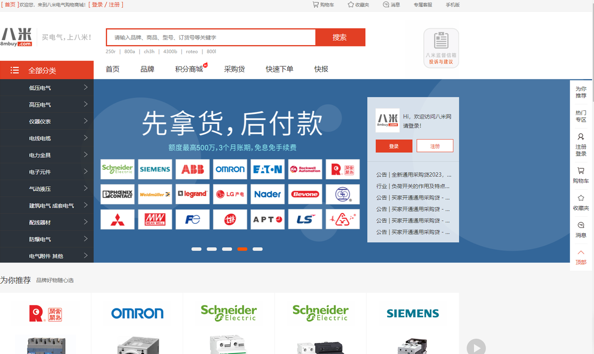 06 八米网工业电气综合服务平台,国内知名电气供应渠道商,提供电气采购、销售及行业服务。类目包括:低压电气、高压电气、仪器仪表、气动液压、电子元件、防爆电气、电线电缆等类目。