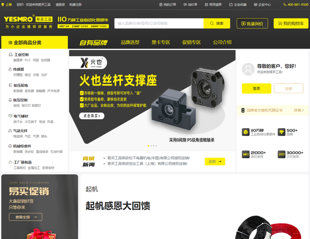 该平台起步于自家的优势电气产品,类目经过不断扩充后,轴承及其他传动件也有销售。