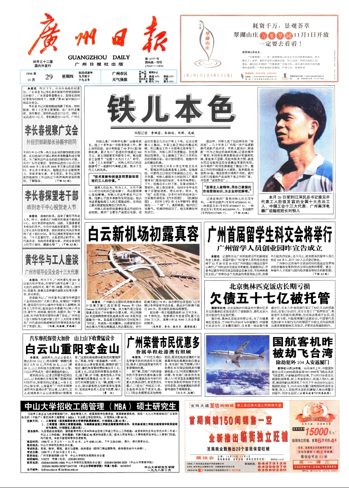 1998年10月29日的《广州日报》头版赫然出现了几个大字:铁儿本色,这篇标题只有4个字的文章用近四千字详细而生动地记述了南洋电器厂工人刘铁儿在平凡岗位上做出的不平凡贡献。