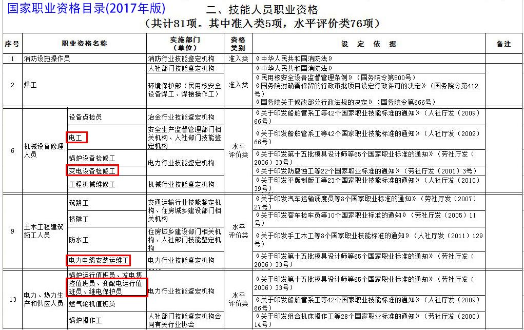 电工进网作业许可证 。这个证书分低压,高压,特种三个类别,低压只能从事0.4KV以下的作业,高压可以从事所有电压等级电气安装、检修、运行等作业,特种类可以在受电装置或者送电装置上从事电气试验、二次安装调试、电缆作业。电工进网作业许可证现在已经被应急部的特种作业操作证(电工作业)整合代替。并不是你有一个电工证,就是电工了,以前很多工作是不需要电工证的,后来随着安全管理加强,只要接触用电设备,都要取得电工作业操作证。供电部门很多工作,如抄表,校表,虽然他们也有电工证,但我们并不把他们看成电工。一个真正的电工应该具备电工技术等级证书和应急部的电工作业操作证。城建部的特种作业操作资格证实际上具有两证合一的性质,这个证书还属准入类证书,不过只局限于建筑工地。至于你的证书符不符合你的作业范围,即使你四证齐全,也难保证你不涉及违规操作,因为作业范围也会有边界模糊,这就要看安全监督检查的了,因为在具体作业范围界定上你没有辨论的机会!