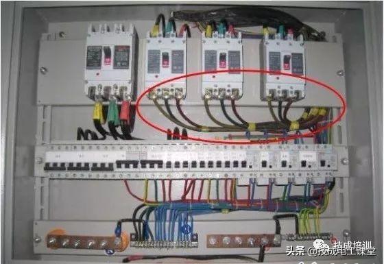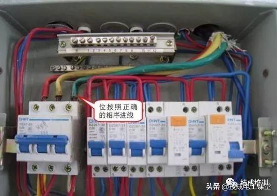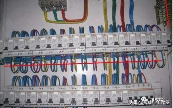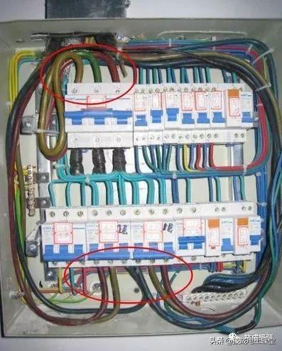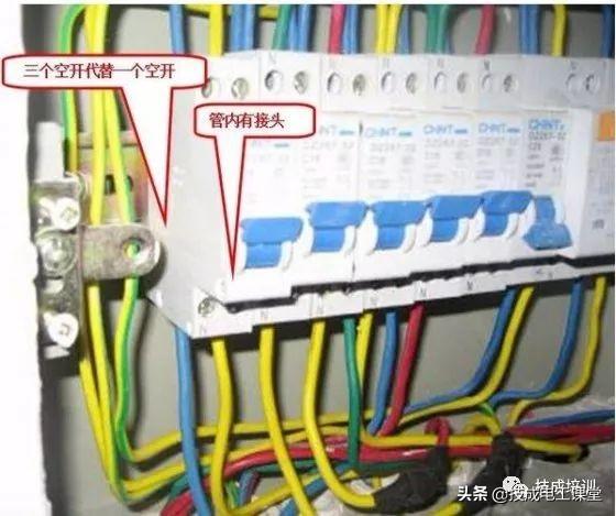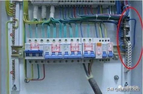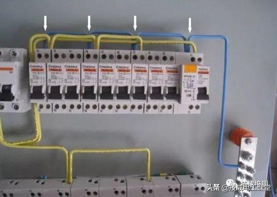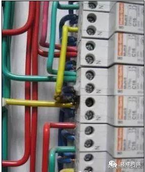 第一排的零线按照进入A相的开关顺序跨接,一般采用2.5mm2的导线时跨接空开的个数不能超过三个。(照片中采用的是4mm2的导线股跨接较多。但是跨接的数量越多容易出问题的机会就越大,如果末端零线烧坏所有跨接的回路都会断电)
