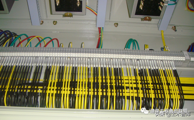有黄色的箭头可以看出总空开下控制下的分空开按照第一排算起1、4、7、10、13、16、19、21、24、27为A相空开的位置,空开所连接的相线导线的颜色均采用黄色。