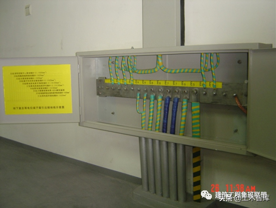 柜、屏、台、箱、盘的金属框架及基础型钢必须接地(PE)或接零(PEN)可靠;装有电器的可开启门,门和框架的接地端子间应用裸编织铜线连接,且有标识。金属导管与配电箱连接处必须做接地跨接,且各管路必须单独与汇流排或接地干线连接,不得串接。