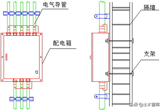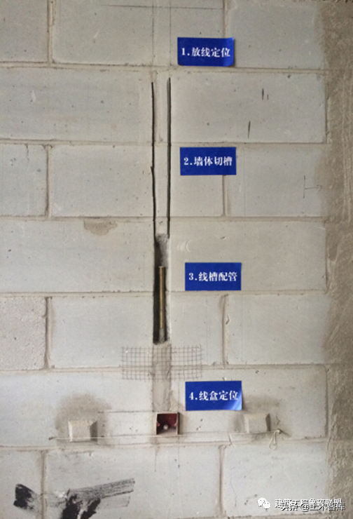 确定开孔位置,并开好孔;固定暗装箱体四角,确保暗装箱体的高度符合要求,并与墙面平正;若箱后仅能抹灰时,总包需在箱后挂钢丝网,再抹灰;若进箱的导管为几根并排暗装进箱时,管槽处也应挂钢丝网,再抹灰。
