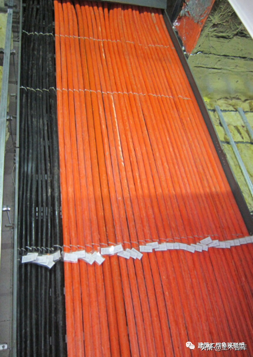 桥架过防火分区墙时应留20mm的缝隙。桥架内的电缆间的缝隙和最上面的电缆与桥架盖板之间用防火胶泥填实,桥架本体和结构间的缝隙先用胶泥填实,再用防火板作外表面封堵。桥架穿纵向防火分区,结构留洞时,要求洞比桥架长大100mm,宽大50mm。建筑高度<100m,每3层在楼板处做防火分隔;建筑高度≥100m,在每层楼板处做防火分隔。安装好竖井桥架,并在需做防火封堵的楼层处,距桥架盖板50mm左右的侧边各钻一个φ12的孔,要求孔比本层地面低100mm;并由土建在桥架穿楼板处做50mm-100mm宽,100mm高的挡水线。