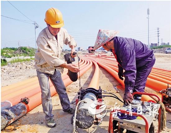 施工人员头戴醒目的黄色安全帽,将一条条橙色的电力管线有序排布在宽阔的道路路基上。这是近日乐清日报全媒体记者在电器城大道施工现场看到的场景。